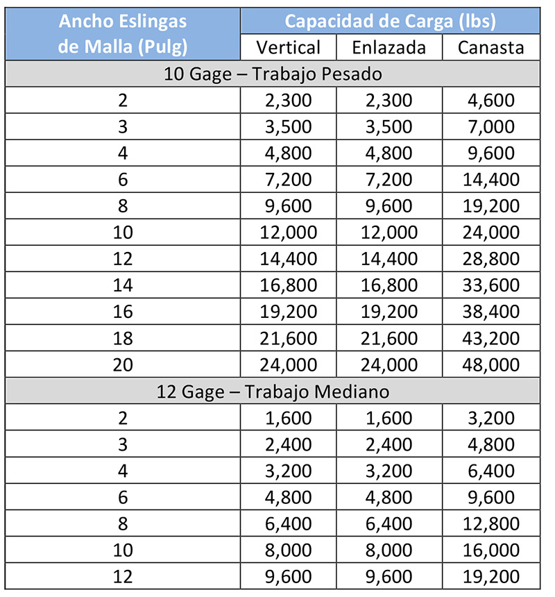 • Las eslingas de malla de alambre no deberán utilizarse a temperaturas superiores a 550 ° F.